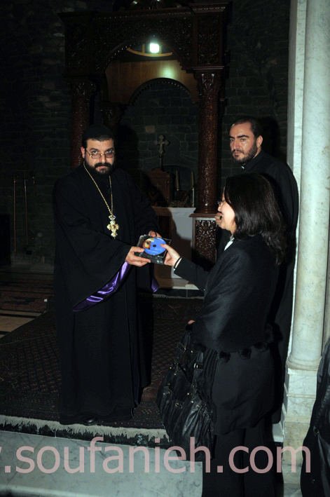 LEvêque orthodoxe reçoit de la main de Myrna quelques exemplaires du film de « Notre Dame de Soufanieh » qui a été réalisé à loccasion du 25ème anniversaire de l’évènement de