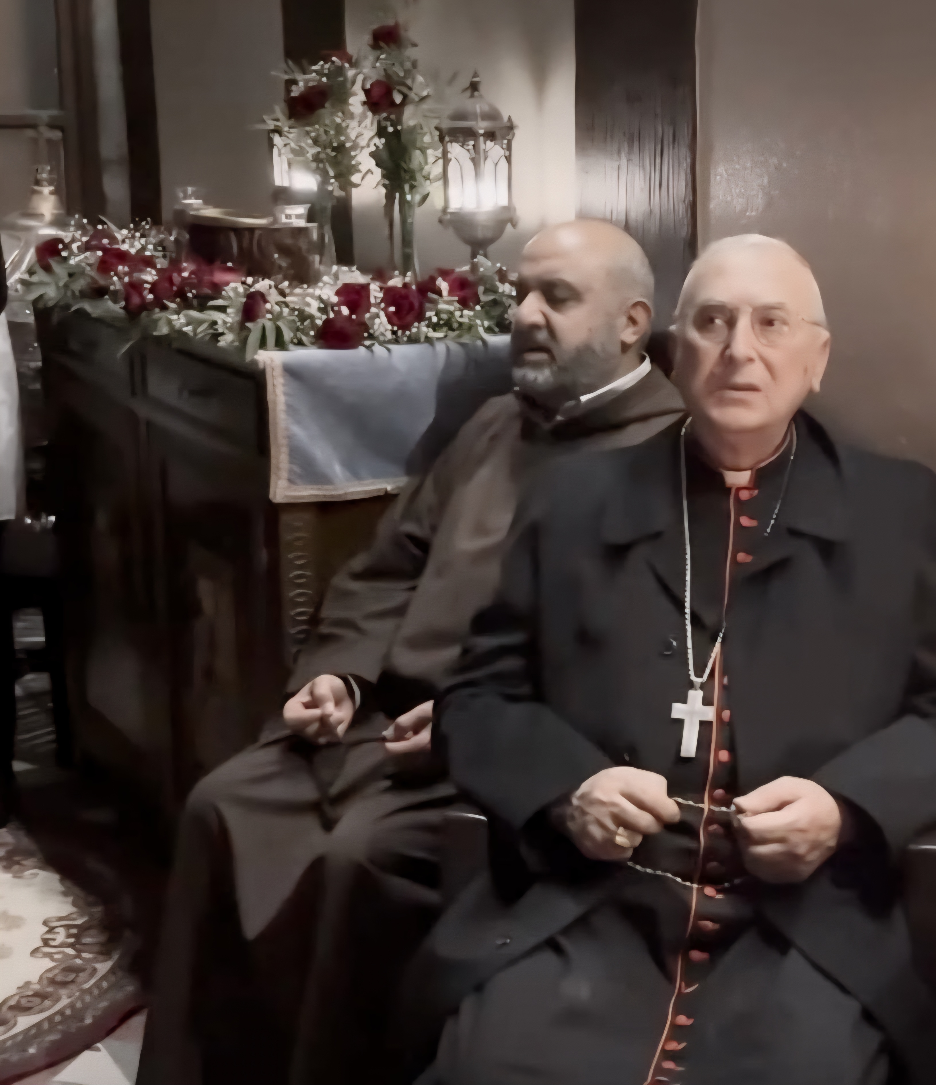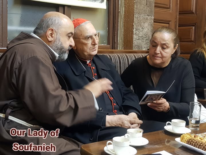 With Cardinal Mario Zenari praying in Myrna's house Avec le cardinal Mario Zenari en prière dans la maison de Myrna